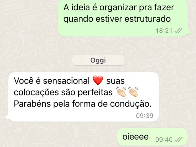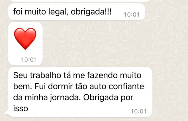 Os encontros ao vivo são on-line, 1x por semana, com duração média de 1h30, fora do horário comercial. Além disso, caso não possa participar em um dia, todos os conteúdos são gravados para ver posteriormente quantas vezes desejar;